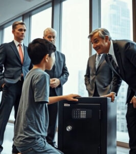 The boy approached the safe, his face thoughtful. He studied it closely, the way a child studies a puzzle, unhurried and curious.